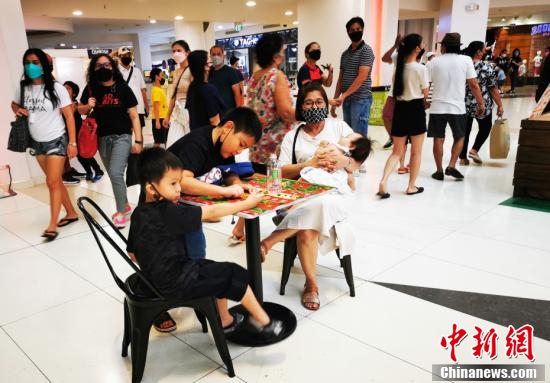 11月21日,菲律宾首都大马尼拉CBD马卡蒂商圈GLORITA商场恢复现场表演,演员们带着口罩吟唱圣诞歌曲。(中新社记者 关向东 摄)
