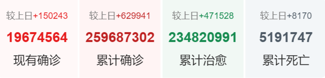 世卫组织网站最新数据显示,截至欧洲中部时间24日18时49分(北京时间25日1时49分),全球确诊病例较前一日增加662163例,达到258164425例;死亡病例增加7682例,达到5166192例。