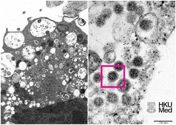 圖右則是高倍電子顯微鏡下受感染的Vero E6細胞。照片顯示病毒顆粒,其表面呈現皇冠形的刺突蛋白(見紅框)。