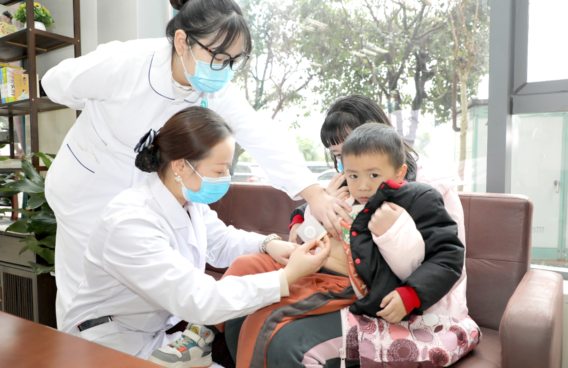 近日,重庆市江津区中医院门诊开展的“三九贴”服务非常受欢迎,等待贴敷的患者排起了长队。图为该院医务人员为儿童贴“三九贴”。通讯员蒋晨摄