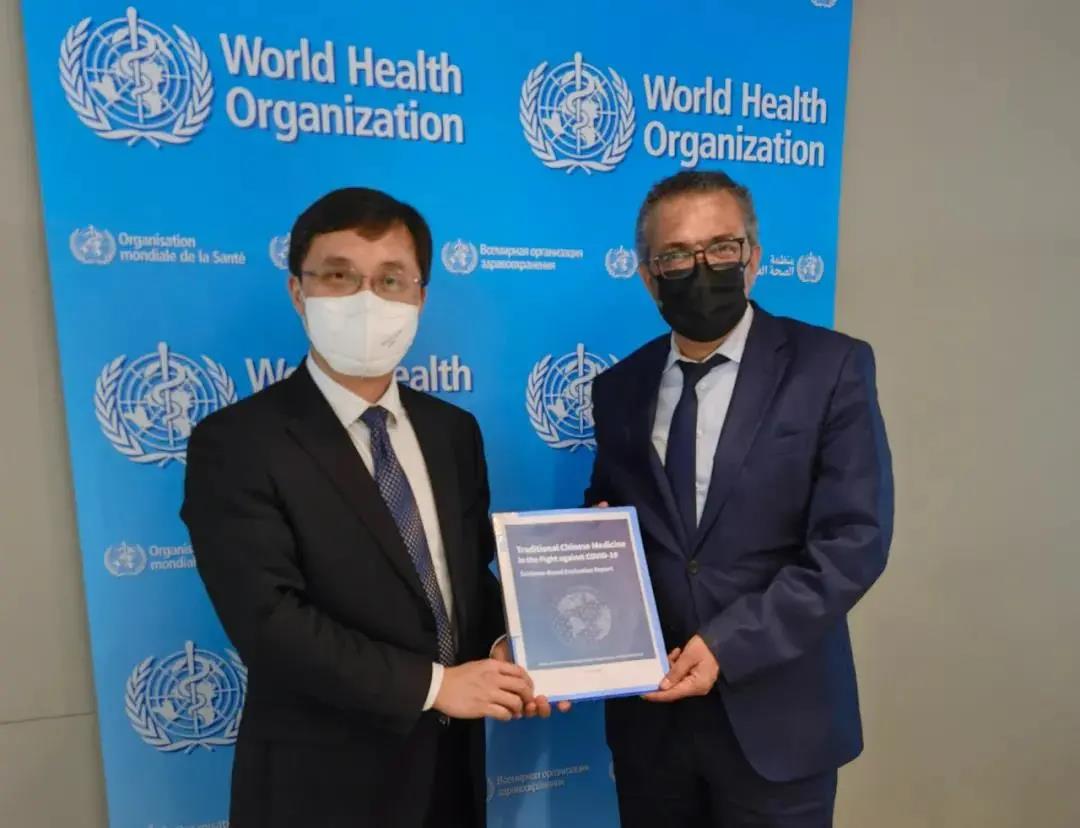黄璐琦代表中国中医药循证医学中心向谭德塞递交了《中医药治疗COVID-19循证评价研究报告》,该报告用科学方法系统评价了中医药的有效性和安全性。谭德塞欣然接受了研究报告。苏珊娜对代表团在当前全球疫情依旧严峻,尤其是奥密克戎变异毒株肆虐的情况下到访,深表敬佩和感动。