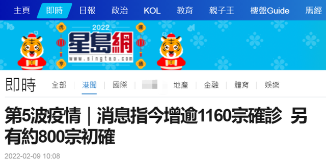 香港“星岛网”9日上午援引消息称,香港今日新增逾1160例新冠肺炎确诊病例,并有约800例初步阳性病例。