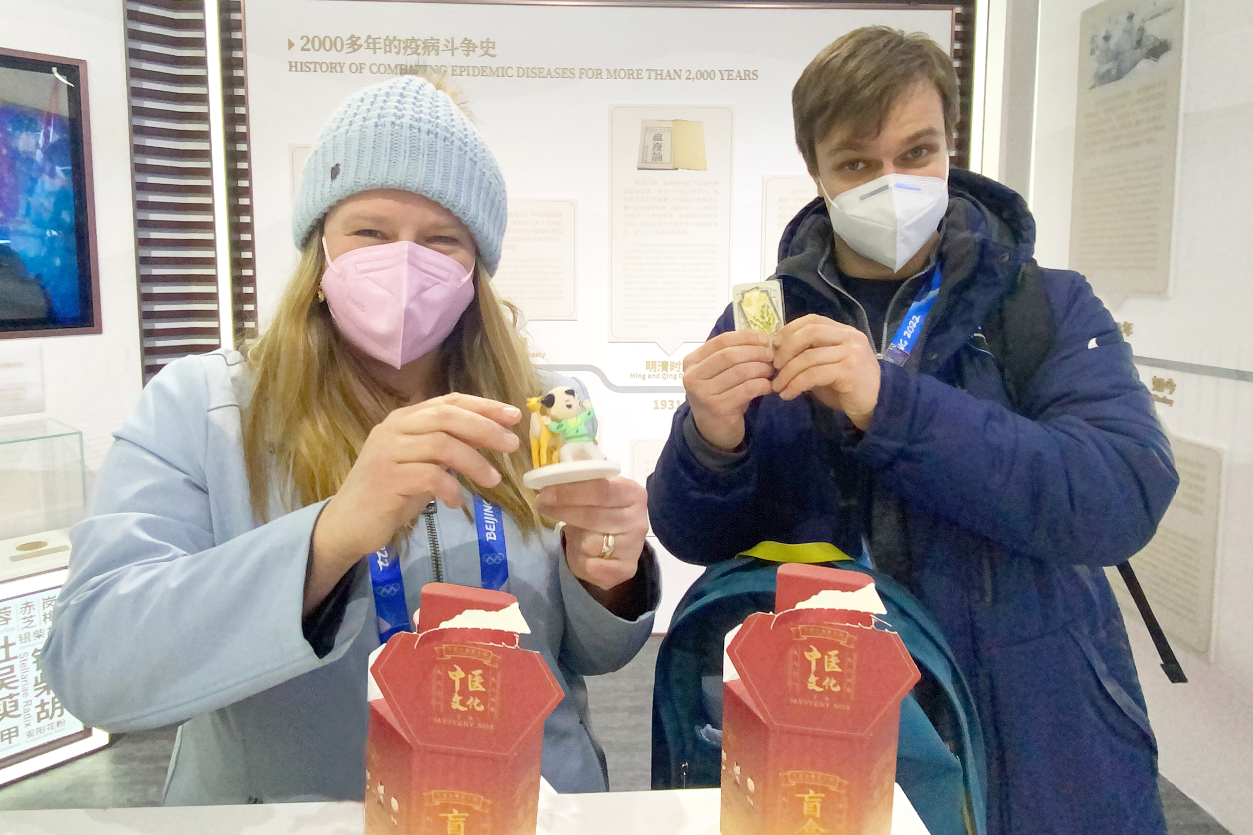 英国广播公司(BBC)两名工作人员展示抽到的五禽戏“鹿”手办和中药书签。徐凡摄