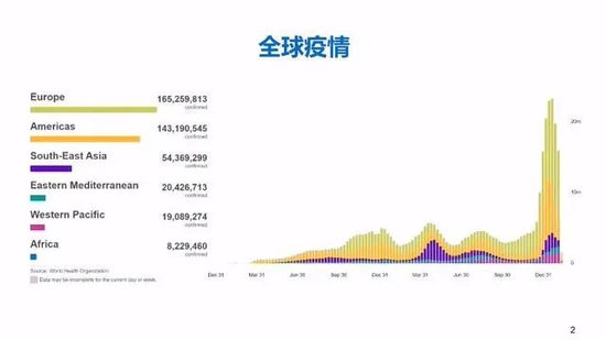 先看一看全球的疫情形势。现在全球正经历第四波新冠疫情,而且第四波远远比前面三波峰值高很多,这里主要是由于奥密克戎的快速传播,同时奥密克戎袭击的时候,欧美国家采取更加放松的方式,没有采取有力的控制措施,不仅使得其本国的疫情造成了快速上升,同时也向世界造成了传播扩散。