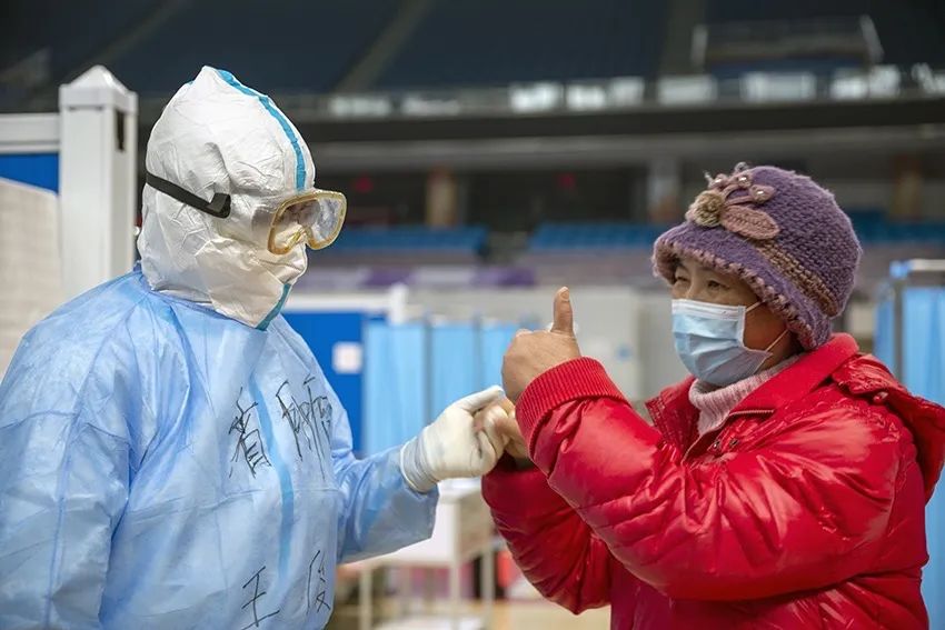 2020年2月,一位痊愈出院新冠患者向医护人员竖起大拇指