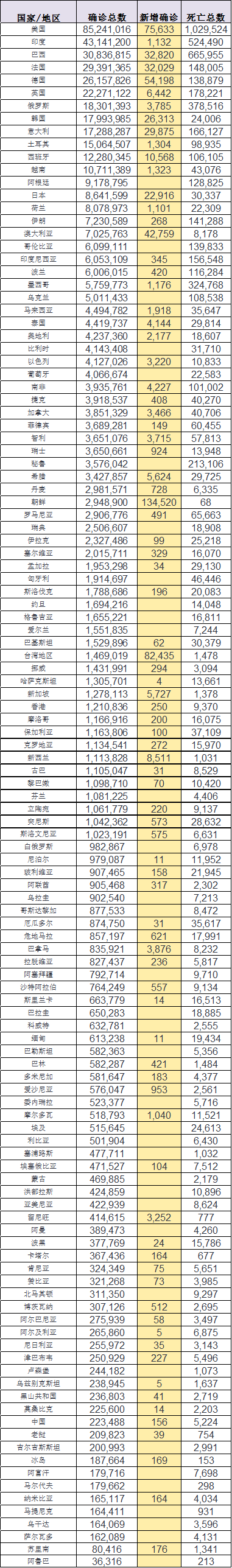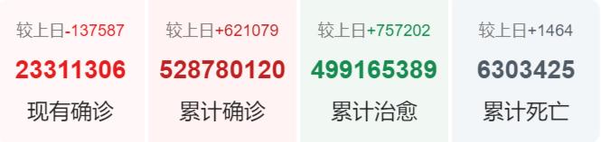根据Worldometer实时统计数据,截至北京时间2022年5月25日6时30分左右,美国累计确诊新冠肺炎病例85145035例,累计死亡病例1029269例;与前一日6时30分左右数据相比,美国新增确诊病例95456例,新增死亡病例290例。