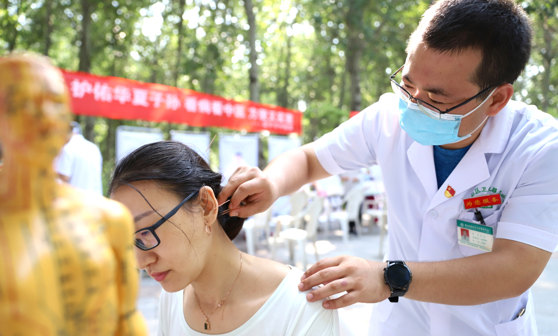 近日,山东省邹平市第二届中医药健康文化节在市民公园举办。本届文化节以“弘扬健康文化共享健康生活”为主题,分为文化传播区和服务体验区。医务人员在文化传播区开展中药辨识、中医药猜谜、中医典故讲解等活动;在服务体验区开展针刺、艾灸、拔罐、耳穴压豆等中医适宜技术服务,并提供清暑益气汤给市民品尝。图为该市居民现场体验中医针灸治疗。郭海涛摄