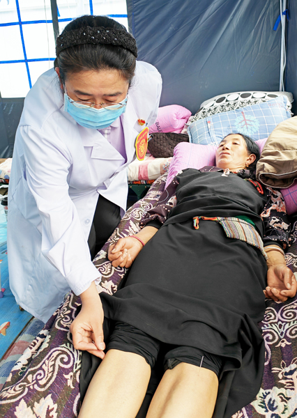 中国中医科学院眼科医院针灸科副主任医师肖桂荣:在马尔康市草登乡,由于刚经历地震,条件有限,我只能带着村民们到简易帐篷里做针灸治疗。他们有的双膝关节痛,有的肩膀痛,还有的整个后背都痛,多由常年劳作引起。我依次给村民们针灸,同时叮嘱他们日常注意劳逸结合。针灸结束后,我示范了几个推拿手法,教给村民们让他们平时可以自我保健。有一位大姐引起我的注意,她在地震前做了妇科微创手术,因地震发生没能按时复查,近几日小腹隐隐作痛,有时痛起来都影响走路。同来的中国中医科学院针灸医院针灸科副主任医师韩颖为她做了腹部推拿,她的腹痛有所缓解。因为术后失于调养,又受地震的惊吓,难免经络阻滞,不通则痛,给予腹部按摩后疼痛得以缓解,我们建议她等条件允许后尽快复查。
