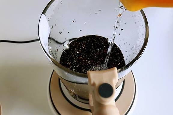 3、将清洗干净的糯米同黑芝麻一起倒入破壁机杯中,同时加入水900ML,如图所示。