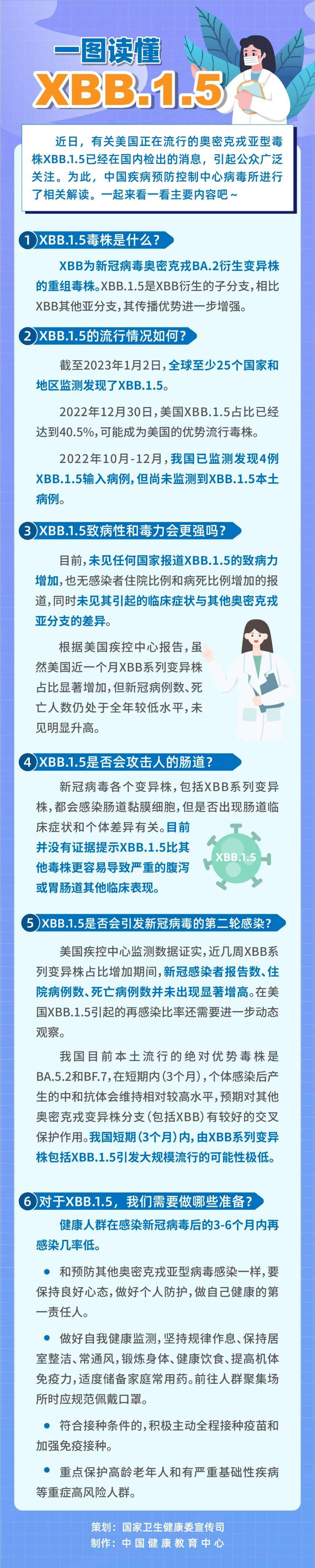 近日,有关美国正在流行的奥密克戎亚型毒株XBB.1.5已经在国内检出的消息,引起公众广泛关注。为此,在国家卫生健康委宣传司指导下,中国健康教育中心根据中国疾病预防控制中心病毒所对XBB.1.5的解读,设计制作了一图读懂,一起来看一看吧~