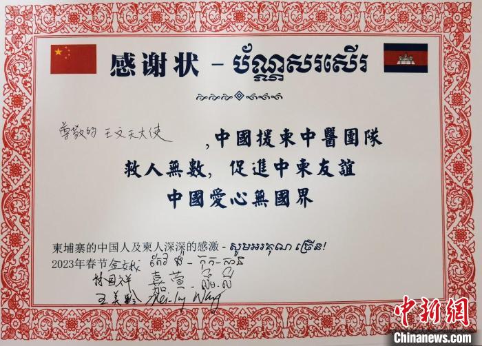 中柬患者感谢状。 援柬中医抗疫医疗队提供