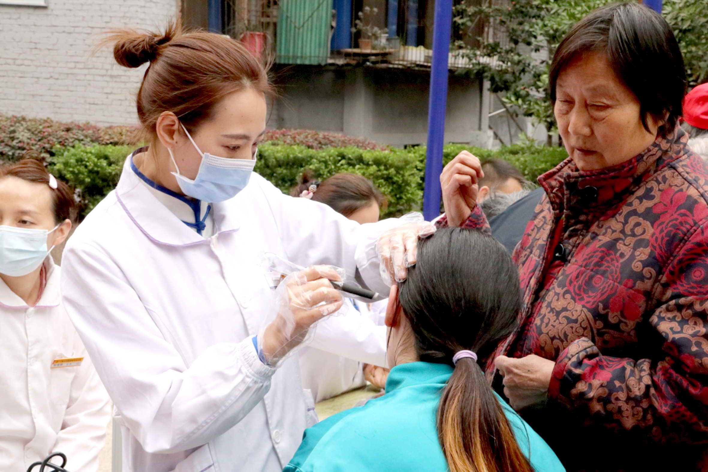 图为该院医务人员为居民进行耳穴灸治疗。王权摄
