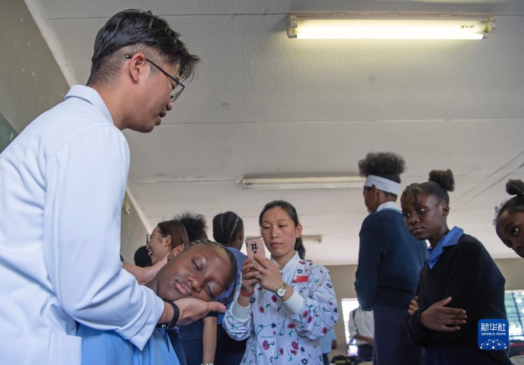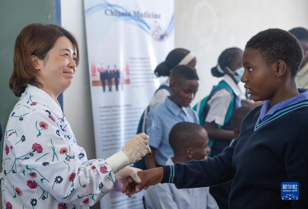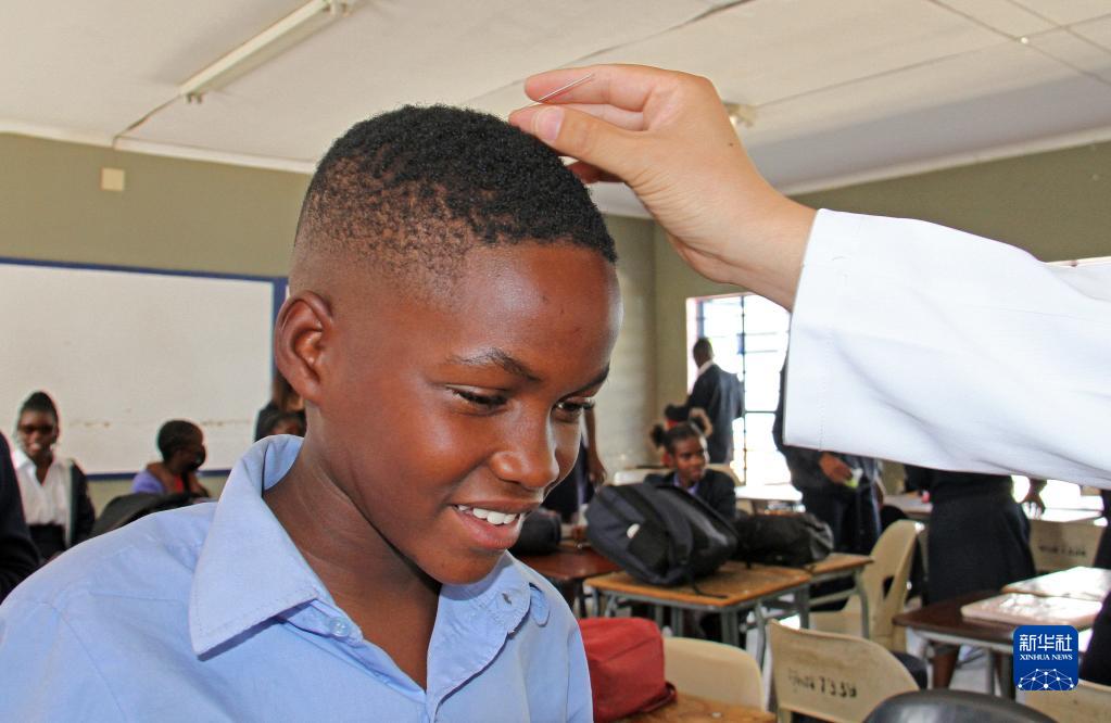 4月3日,在纳米比亚温得和克的伊曼纽尔·谢菲迪中学课堂上,一名学生体验针灸。新华社发(穆萨·卡萨克摄)