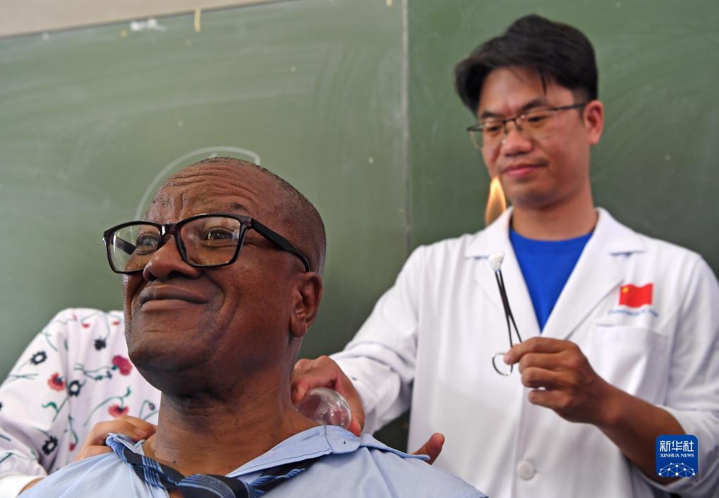 4月3日,在纳米比亚温得和克的伊曼纽尔·谢菲迪中学课堂上,校长卡奇翁瓜体验拔火罐。新华社发(穆萨·卡萨克摄)