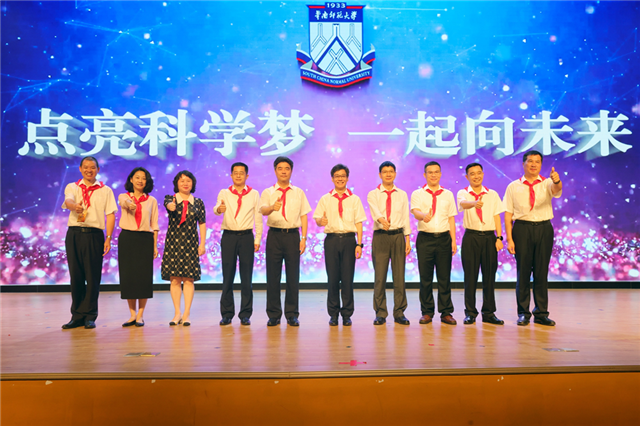 在随后举行的“点亮科学梦 一起向未来”2023年科技节暨六一国际儿童节庆祝活动中,广东省中医院院长张忠德、华南师范大学附属小学党总支书记兼校长张锦庭、COOKBOOK AI实验室创始人容冠斯、华南师范大学信息光电子科技学院院长水玲玲、生物岛实验室科普中心科普总监李静、广东省呼吸与健康学会副秘书长梁莹为“岐黄薪火”中医药文化进校园等6个实践基地揭牌。