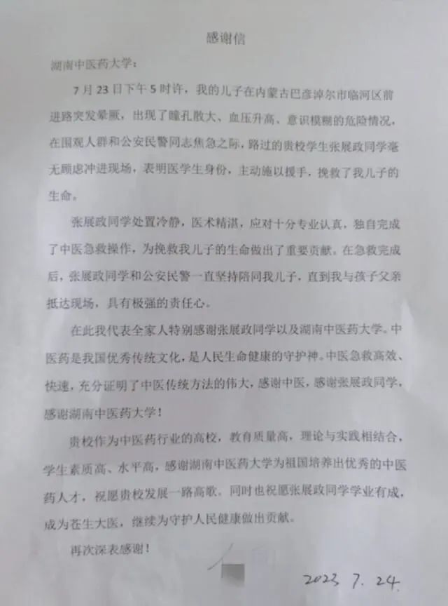 这两天,张展政也听到不少人对自己的表扬,但他觉得,出手相助其实只是医学生的“本能”。而对于自己人生中收到的第一封感谢信,张展政却倍感珍惜。他觉得,这是对刚刚走上学医之路的自己最好的激励。