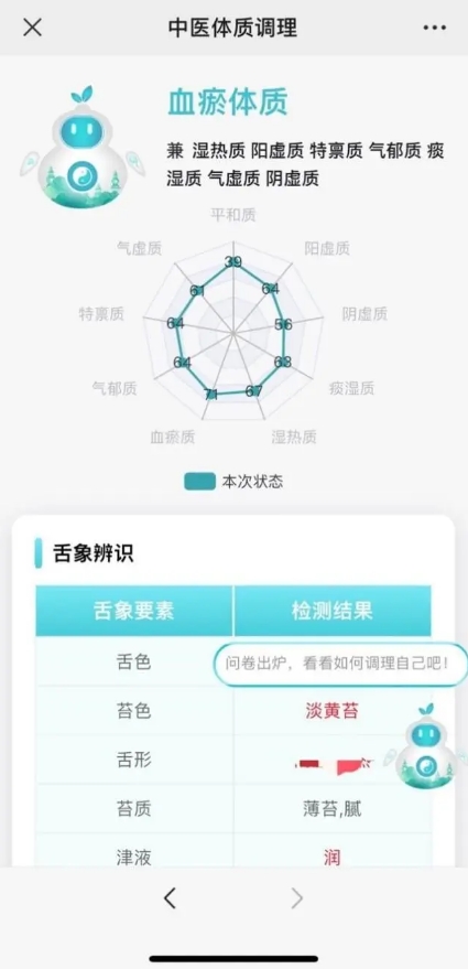 “通过上传的舌象照片,系统会基于计算机视觉技术进行九种体质状态辨析,生成一张健康‘雷达图’。如果用户同步完成体质辨识问卷,还能增强分析结果的精确度。”市卫生健康委中医处负责人介绍,根据图像识别的舌象检测结果及问卷结果,系统会提供涵盖健康状态、体质分类等多维度的分析报告,提醒运动、饮食方面的禁忌,提供自我穴位保健、饮食调养、运动调理、情志调养的个体化方案,还包括中西医保健技能的音频、视频,比如药膳怎么做,不同节气如何保养等等,市民都可点点手机轻松学习。