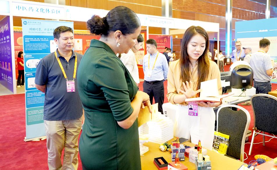 论坛期间,佛得角驻华大使夫人卡拉·多罗萨里奥被独具中国风韵的中医药文创产品所吸引。