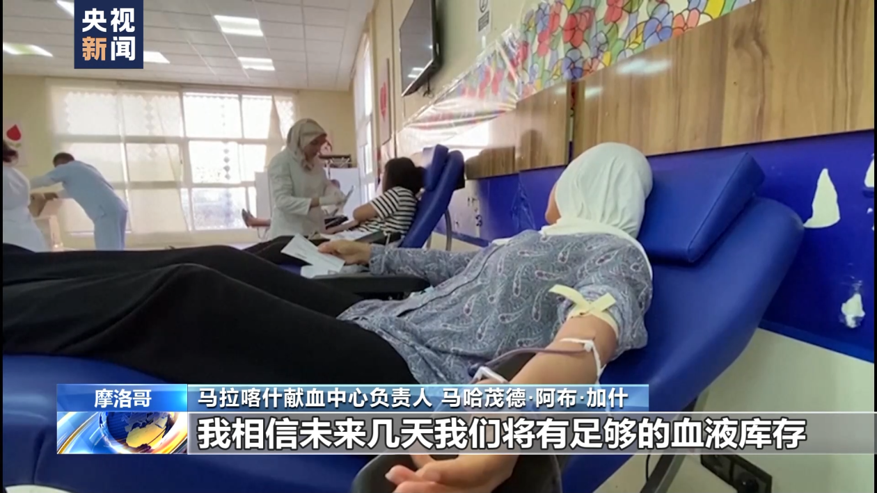 马拉喀什献血中心负责人 马哈茂德·阿布·加什:健康中心和医院的伤员急需血液。我们昨晚号召大家献血,正如你9日一大早就看到的,前来献血的人非常多,这是一个很好的迹象。我相信未来几天我们将有足够的血液库存。