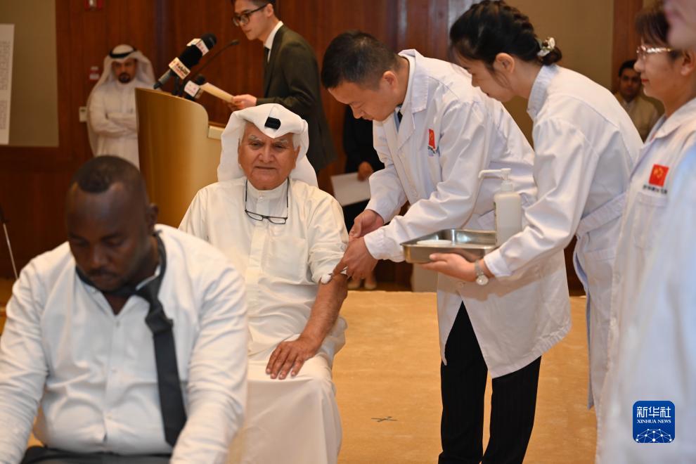 这是9月11日,中国(吉林)第15批援科威特医疗队队长陈春海(中)在科威特大穆巴拉克省举行的中国援外医疗队派遣60周年暨中国援科医疗队派遣47周年纪念仪式上展示针灸治疗。新华社发(阿萨德 摄)