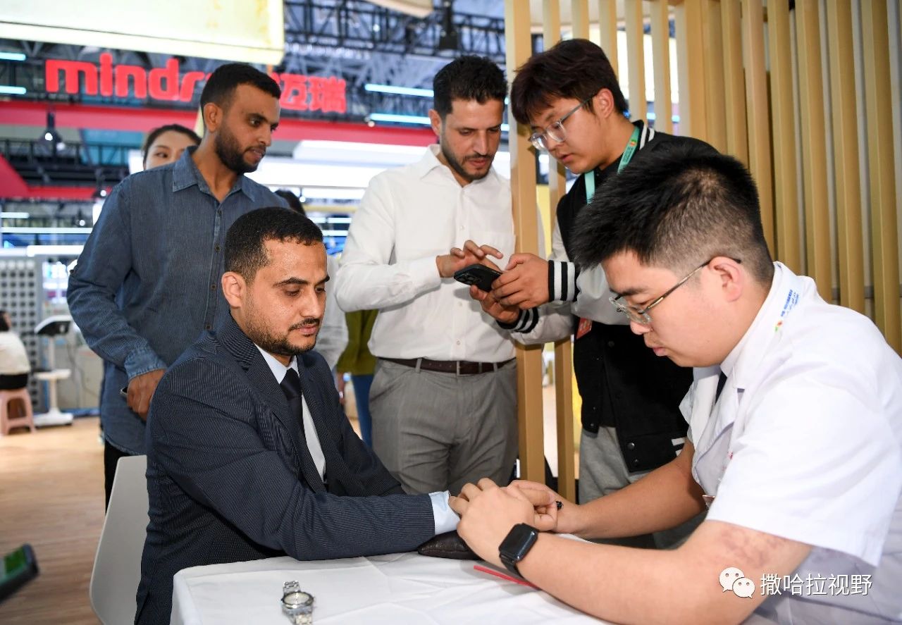 9月21日,嘉宾在第六届中国-阿拉伯国家博览会医疗康养展区体验中医。新华社记者 冯开华摄