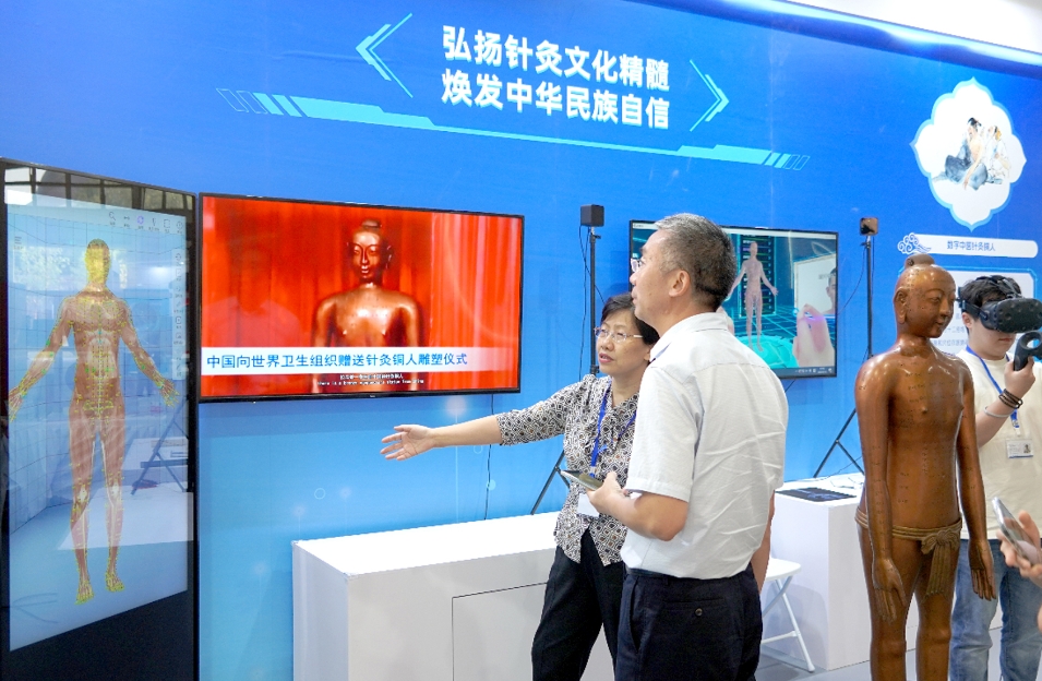 展区以现代科技手段与传统技艺方法为依托,围绕“文化自信”“面向人民生命健康”两个主题,向观众展现中医针灸的文化魅力与科学原理,展区内不仅设有中医针灸非遗文化宣传视频,还设有VR中医针灸铜人、数字中医针灸铜人、中医智慧养生空间、实体针灸铜人等一系列展品。