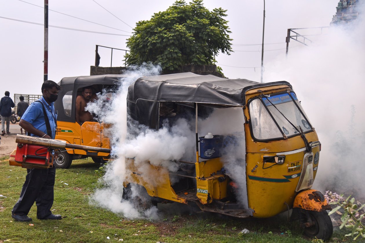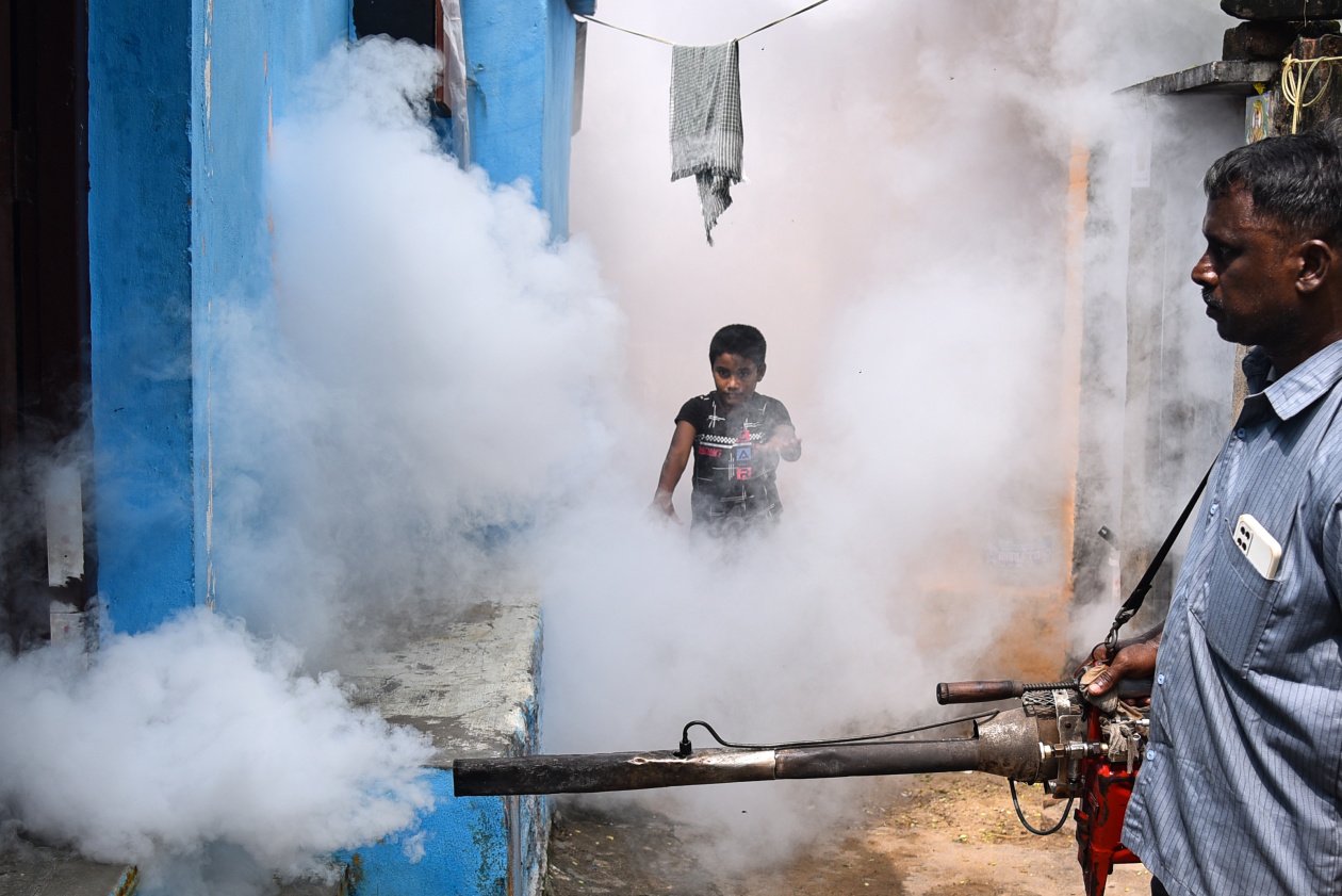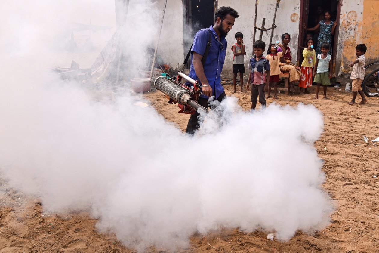 当地时间2023年10月14日,印度金奈,工作人员使用熏蒸法对贫民窟进行消毒,以预防登革热和其他蚊媒疾病的传播。
