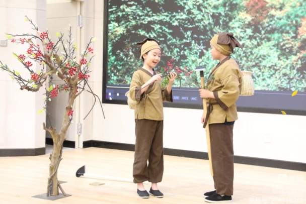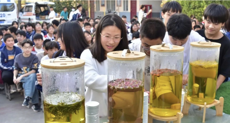 西安市曲江六小的学生们在教师指导下,运用课堂所学中医药知识,制作了中药饮品,并编排原创戏剧《茱萸的故事》进行了展演。