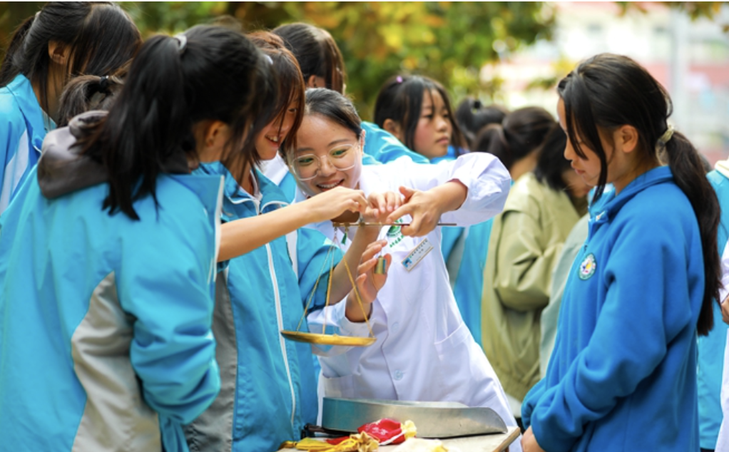 在贵州省黔西市雨朵镇雨朵中学,该市中医医院医护人员指导学生制作防疫香囊、配制菊花清新茶饮,学生还可以现场学习穴位按摩、亲身体验中药制作等,活动让学生们在寓教于乐中学习到了实用的中医药文化科普知识。