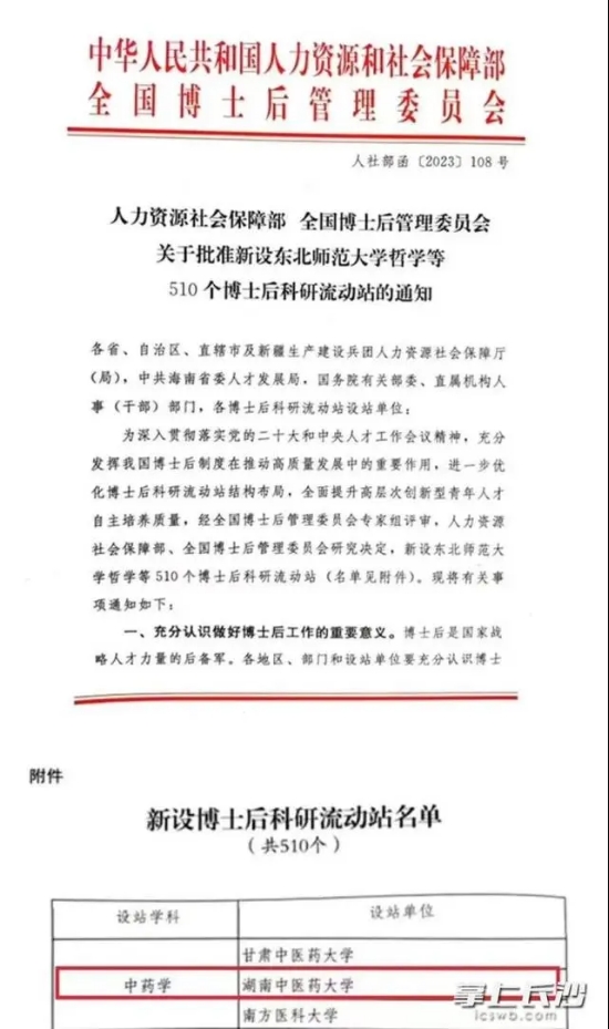 据了解,此次获批中药学博士后科研流动站,是湖南中医药大学贯彻落实人才强校战略的重大成果,对进一步加强学校学科建设、培养高层次人才、打造高水平科研团队、产出高水平科研成果、扩大学术交流、助力学校“双一流”建设具有重要意义。该校将持续加强博士后科研流动站建设,精准把握博士后“科技创新生力军、人才队伍蓄水池、学科建设重要支撑”的定位,加大人才引培力度,推动产学研融合,加快科研成果转化,为推进学校内涵式高质量发展和中医药事业建设提供更加坚实有力的人才和智力支撑。