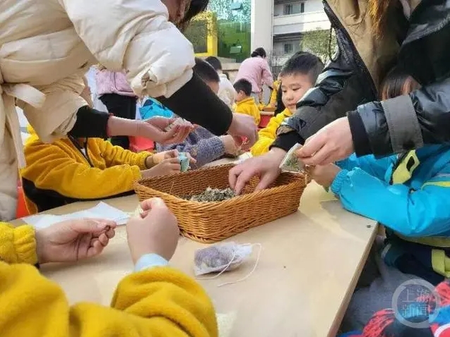 现场,朱艺还为孩子们介绍了玫瑰花、腊梅花 、菊花、石菖蒲、艾叶等多味中草药的性味、功效,以及在什么情况下可以去使用,并带动孩子们现场动手制作可以防疫的中药香囊,好喝又健康的“三花枣茶”,还有能够养肝明目的“明目足浴包”等。