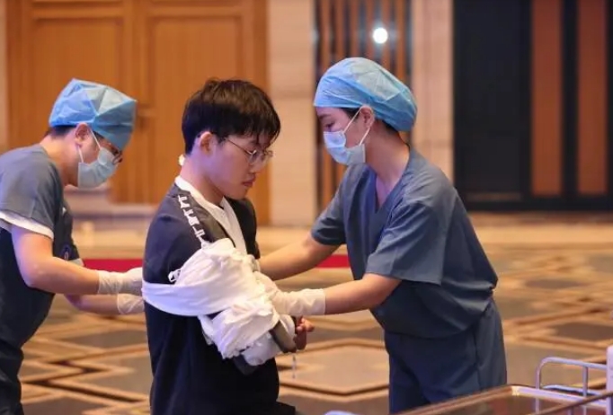 本次比赛分为技能操作、桌面推演和知识抢答3个部分。其中,技能操作包含穿脱防护服、伤口止血包扎、双人心肺复苏及电除颤3项内容,分别在10分钟、6分钟、3分钟内完成;桌面推演则重点考查某医院发热咽痛多起病例的应急处置,题型为若干道简答题,队员在限定时间内完成答题;知识抢答赛分为单选题、多选题和判断题,内容涉及院感、传染病、公共卫生、紧急救援和应急知识。