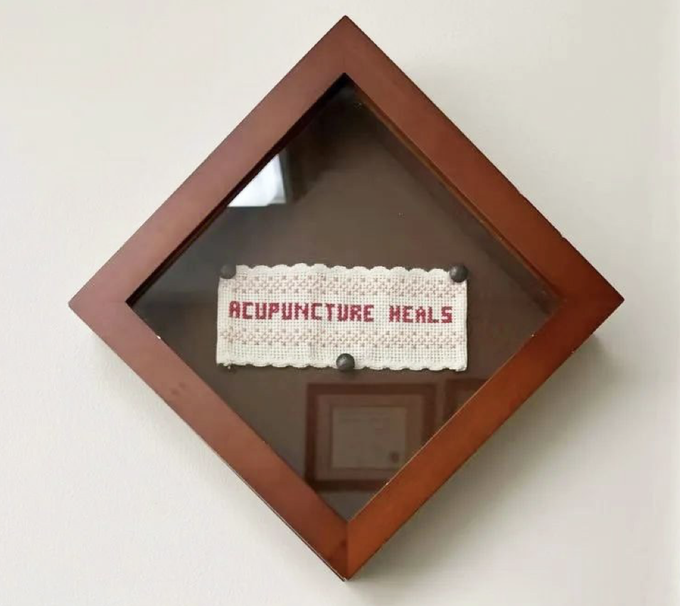 在绣牌上,患者用红线编织出英文ACUPUNCTUE HEALS。她告诉我,这是她在思考很久以后,才想出来的对针灸的一种解释。我对这个短语十分欣赏,觉得是“一语中的”。