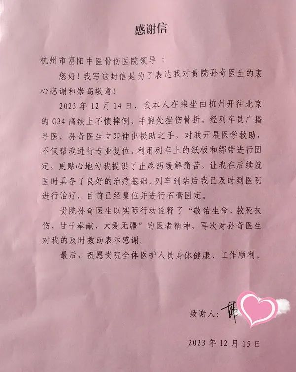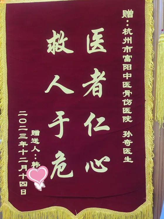 韩女士在感谢信中说:“孙奇医师不仅帮我进行专业复位、固定,还贴心地为我提供止痛药缓解痛苦,让我在后续就医时具备良好的治疗基础,目前我已经复位和石膏固定。敬佑生命、救死扶伤、甘于奉献、大爱无疆,再次对孙奇医师对我的及时救助表示感谢。”而锦旗上的“医者仁心、救人于危”也表达了韩女士对孙奇的感谢。