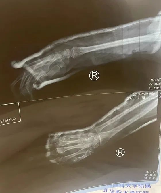 “右手手腕直接歪了,肿胀也比较明显。”孙奇观察韩女士伤情后判断是餐叉样畸形,典型的桡骨远端骨折,这种伤势一般因为摔倒后手撑地引起。起初,他还以为就是去看看,不一定有“用武之地”,没想到却是“碰上了医院的核心业务——手法复位”。