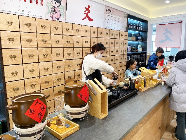 “您是送亲戚、朋友,还是想自己喝呢?如果是自己吃,就可以选择小建中膏,它可以健脾养胃、调理气血……”在校园一侧的国医堂,大四学生晁豌垚正颇有专业范儿地向在附近居住的市民李女士介绍面前的中医药纸包类养生小零食:阿胶糕、山楂丸、芝麻丸、党参蜜饯、清滋膏、四物膏、酸梅汤药包……一袋袋手掌大小、包装上印有古风IP形象的精美产品在柜台上整齐排列,吸引着过往顾客。而真正的“大咖”在柜台的另一端:三口圆鼓鼓的中药砂锅正冒着“仙气”,“肚子”里熬煮的正是当日主打品牌“爻茶”。