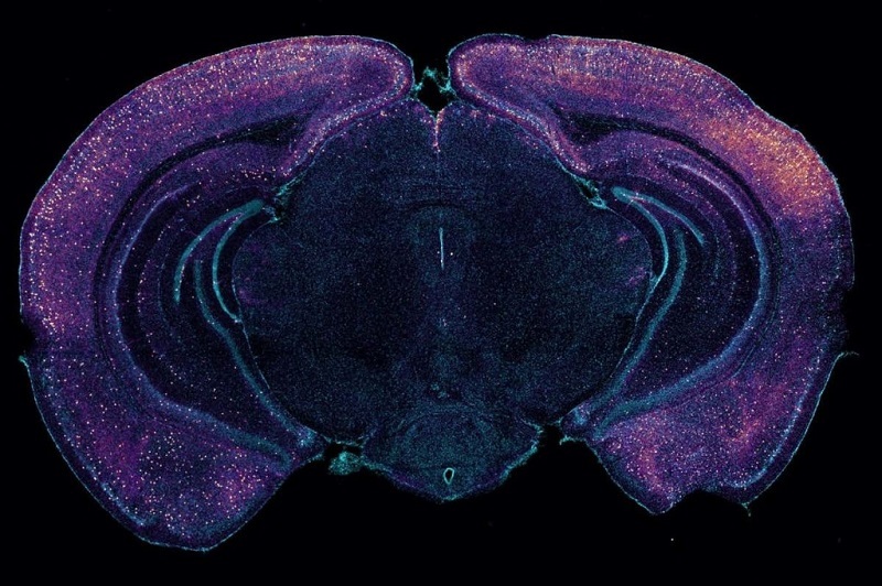 小鼠大脑的横截面,显示神经元似乎释放出能更好清除毒素的分子。 图片来源:《自然》网站