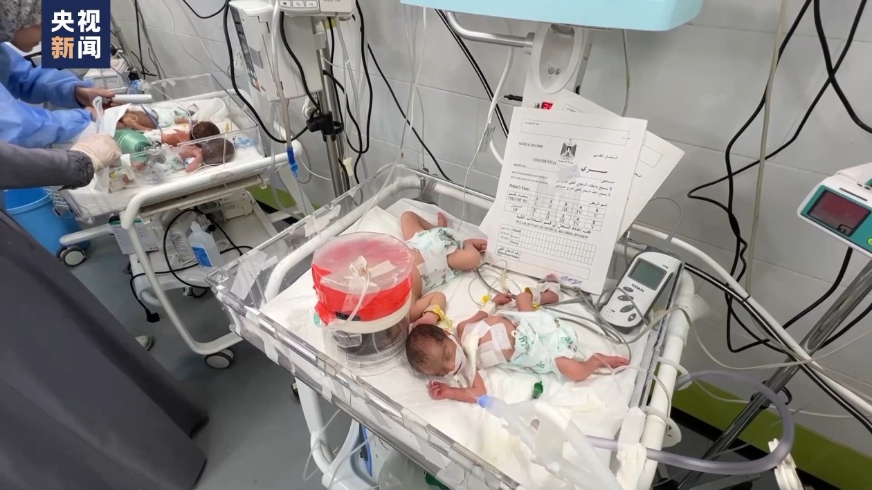 总台报道员 艾哈迈德·扎古特:这里是阿联酋新月妇产医院,这家医院设有新生儿科,目前这家医院面临着巨大压力,流离失所者大量涌入拉法市,医院不得不将两到三个早产儿放在同一个保温箱里。这里的医生说,这或许会对新生儿产生负面影响,但因为以色列在加沙地带开展的军事行动,这是他们的无奈之举。