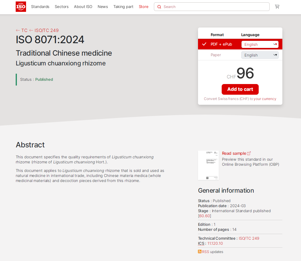 川芎是著名的川产道地药材,应用广泛,2020年版《中华人民共和国药典》(一部)收载中药成方制剂和单味制剂1607种,其中含川芎成方246个,占比15.3%。为深入推进四川中医药出川出海,高质量融入“一带一路”建设,2019年,在国、省两级市场监督及中医药主管部门指导下,由省中医药标委会国际标准提案专家川农大侯凯博士与荷兰SU生物医药王梅博士领衔、副主任委员莫玲教授代表中方团队协助,省中医药科学院组织协调省药品检验研究院、中国测试技术研究院、中国标准化研究院、省产品质量监督检验检测院等科研院校和企事业单位,组成技术团队联合发起“中医药-川芎”国际标准提案,于2021年7月通过投票获得正式立项。提案针对川芎药材在国际贸易中的困扰问题,结合相关国家和区域药典等标准收载情况,对包括挥发油、水分、浸出物、农残、重金属等重要指标进行深入研究和考察,通过反复磋商和充分讨论,与各国在指标设置及限值规定达成共识。