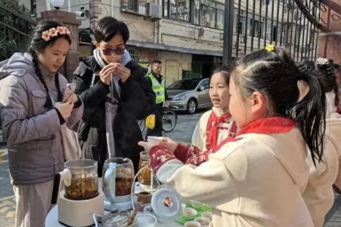 烹茶、献茶,茶饮社团的同学们以中华传统的敬茶礼仪向远方来客表达热情待客之道。校园内的《小神农中医药文化探寻》课程作品展示区则吸引了不少留学生们驻足欣赏,礼仪队员用熟练的英语向外宾介绍同学们用劳动创造的一件件精彩作品。