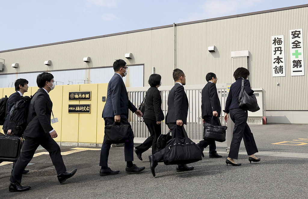 2024年3月31日,日本和歌山县木川市,厚生劳动省工作人员进入小林制药子公司Meitan Honpo的工厂进行现场检查。(视觉中国)