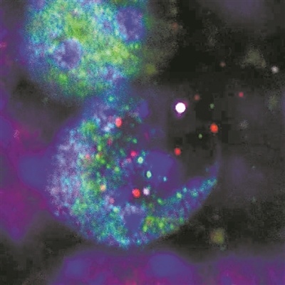 学习过程中神经元细胞核DNA受到损伤,释放出DNA(右中大白点)、组蛋白(紫色)和转录因子(红色和绿色)。图片来源:阿尔伯特·爱因斯坦医学院