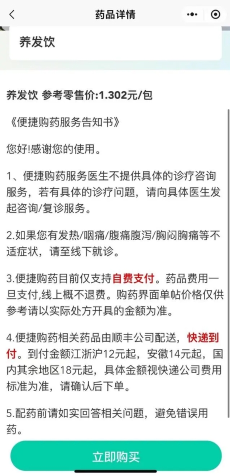 据了解,“养发饮”目前只走线上渠道:在杭州市第三人民医院公众号菜单中点击“互联网医院”,点击“互联网诊疗”,在“便捷购药”选项里选择“养发饮”,仔细看完便捷购药服务告知书,进行相应测试后开出药方就可以了。