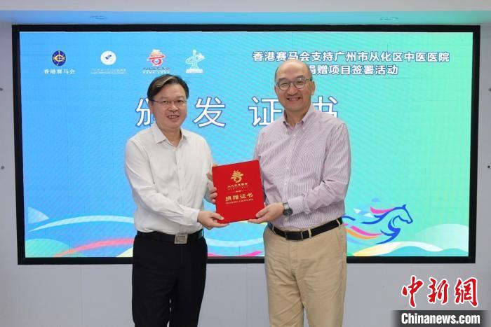 广州市从化区委书记董可(左)向香港赛马会公司事务执行总监谭志源(右)颁发慈善捐赠证书。香港赛马会 供图