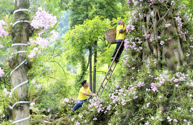 四川省泸州市合江县福宝镇福森种养专业合作社工作人员在采摘石斛花。赵运懿摄