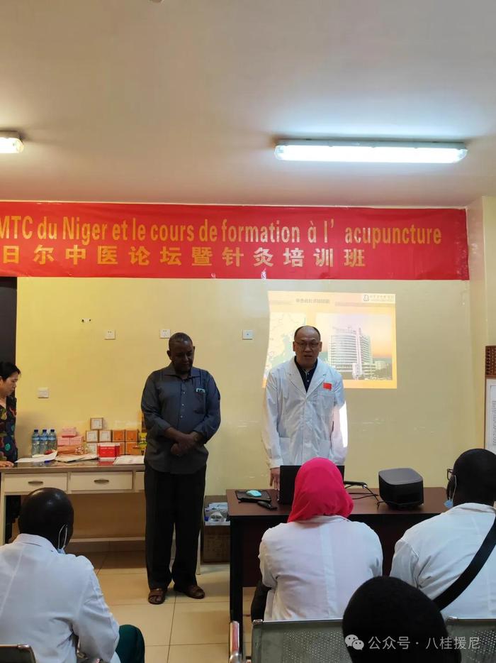 培训班由第23批援尼日尔中国医疗队副队长梁志清主持,在培训正式开始前邀请了第23批援尼日尔中国医疗队队长凌永平作开班致辞,凌永平向学员介绍了中国政府自1976年起派遣援尼日尔医疗队,目前共派出23批次724人次,本批医疗队进驻尼日尔综合医院时间以及为当地民众无偿提供医疗服务所作出的贡献。