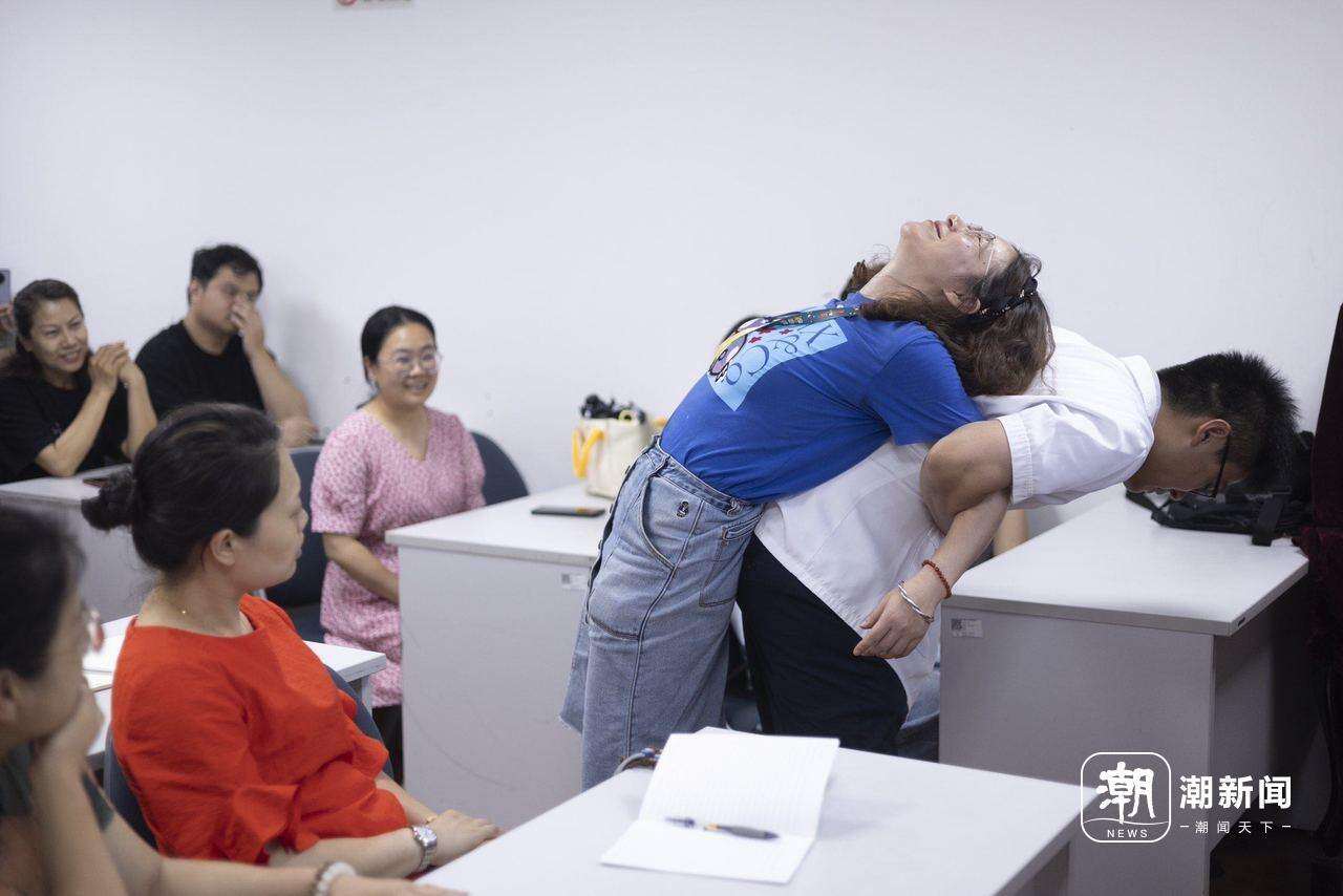 只见芮康乐缓慢扭动身前学员的脖颈,判断颈椎曲度变直的程度,最后找准角度一掰,颈椎发出“咔咔”劲响,引得台下一众惊呼。“这种手法要找专业医生,现在我就教大家平时怎么使用‘一指禅’手法自我松解。”一番操作,迅速调动了课堂氛围。