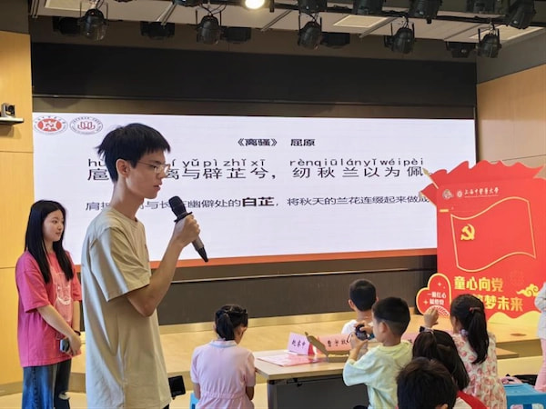 在中医药文化氛围浓厚的大学校园里,小学生们在志愿者的带领下,体验小“神农”识 “百草”,化身小中医师共同探寻中医药奥秘。在课程设计上,上海中医药大学注重寓教于乐、学做结合,将学习中医药知识和锻炼动手能力相融合。小学生们边听故事,边了解中医药的起源和历史;亲手制作香囊,学习常见中草药的特性;练习八段锦、五禽戏等传统功法,感悟纵横古今的中国智慧……各式中医药文化体验活动,激发了小学生对中医药知识的学习热情和对中医药传承的使命责任。今年上海中医药大学的爱心暑托班课程中融入了许多中华优秀传统文化的元素,如经典朗诵、民乐赏析等。课堂上,志愿者带领小学生们朗读经典名著,涵养“腹有诗书气自华”的文化底蕴。二胡、古筝、琵琶等民族传统乐器搬进课堂,引领小学生们穿越千年音韵,感受中国民乐之美。此外,浦东新区团区委为暑托班送来两堂传统文化课程——古诗词贴画、皮影戏DIY。古诗词贴画课程以经典古诗词为灵感,巧妙地将文字转化为视觉元素,让小学生们在创作古诗词贴画的过程中,体会诗词中的意境与情感;皮影戏DIY课程带领小学生们体验皮影角色制作,学习皮影戏的历史渊源、制作工艺及表演技巧。一堂堂传统文化课程让小学生们多维领略了中华优秀传统文化的独特魅力,让中华民族的文化基因根植在孩子们的心田。