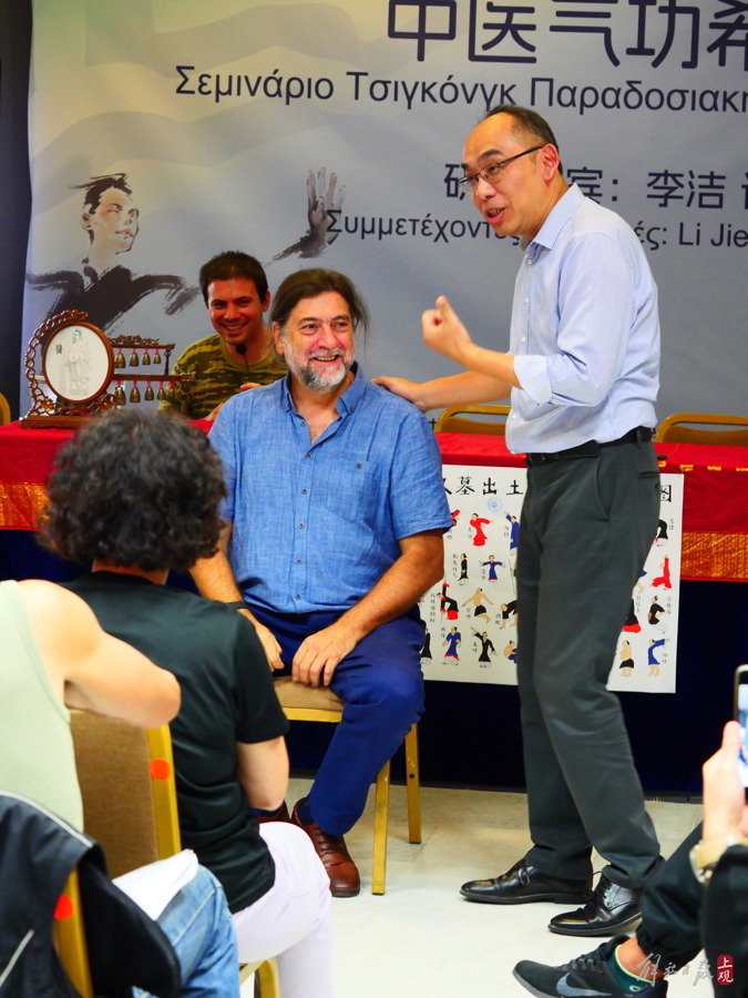同为文明古国,希腊与中国一样拥有底蕴深厚的医学传统,古希腊名医希波克拉底成为西医奠基人,被西方尊为“医学之父”。在希腊首都,解放健康讲坛首先来到2004雅典奥运会比赛场馆,走进希腊武术功夫协会,举办中医气功希腊研讨会。上海中医药大学上海市中医药研究院综合办公室主任李洁教授为慕名而来的希腊武术功夫协会会员们开设专题讲座,主讲太极文化促进人类健康,并与希腊针灸协会原会长、武协现任秘书长亚尼斯等共话传统医学传承和创新。