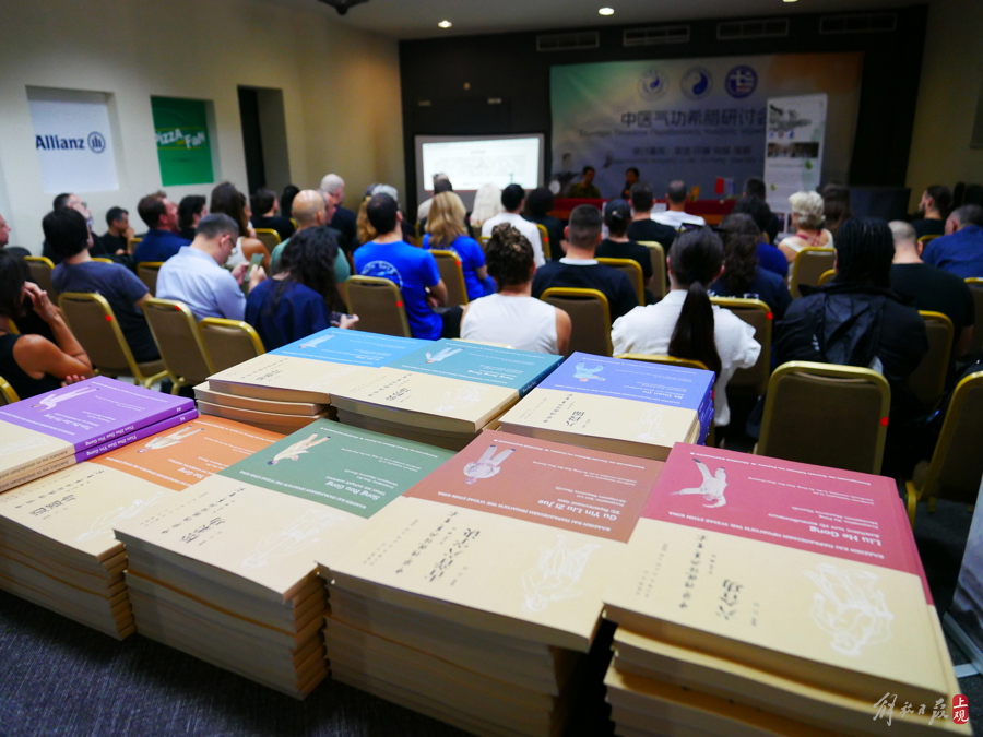 在中医功法开放日的互动体验环节,从医学专业人士、理疗师到武术练习者、健身爱好者,当地学员跟随上海专家一起操练传统功法,感受海派中医文化所蕴藏的中华文明内涵。上海市气功研究所所长许峰教授理论结合实践,分享易筋经、古音六字诀、逍遥功、八段锦、天柱导引功、松柔功、六合功和放松功等养生术,并以亚尼斯等志愿者为“模特”,现场演示十多种中医推拿手法,引来全场手机亮屏摄录。当日,陆颖等上中医教师也带领受众站桩练功,同样深受欢迎。